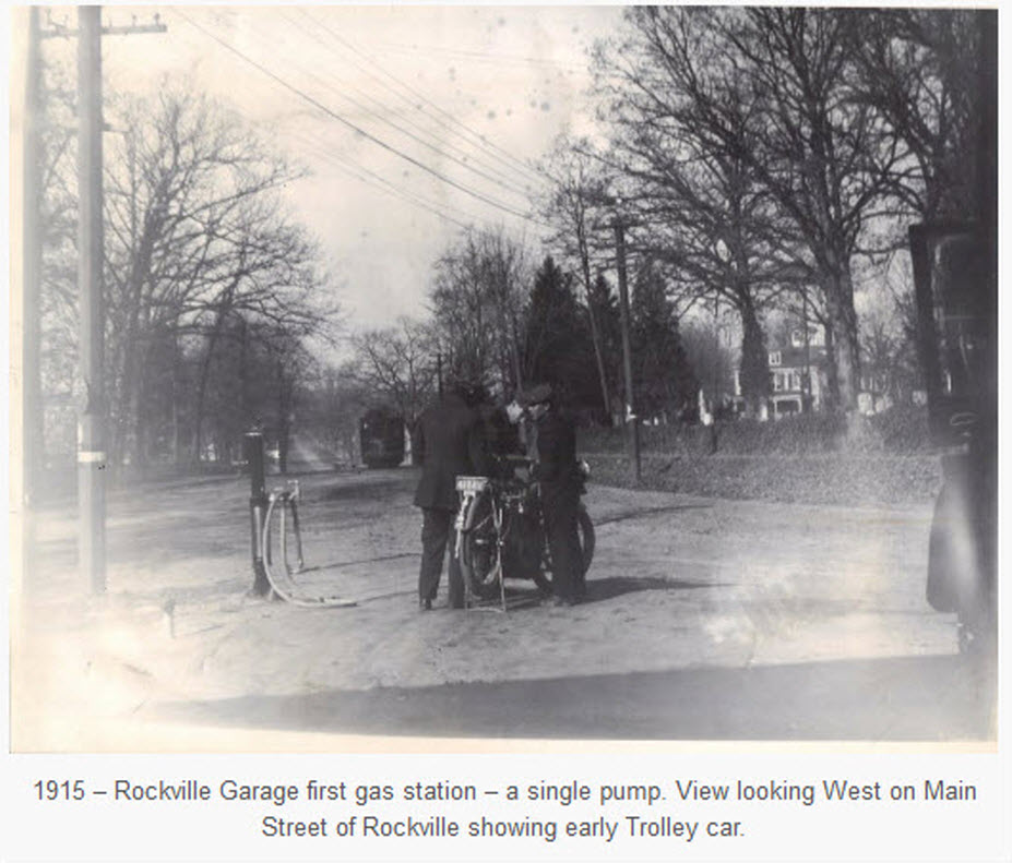 1915 – Rockville Garage first gas station – a single pump. View looking West on Main Street of Rockville showing early Trolley car.