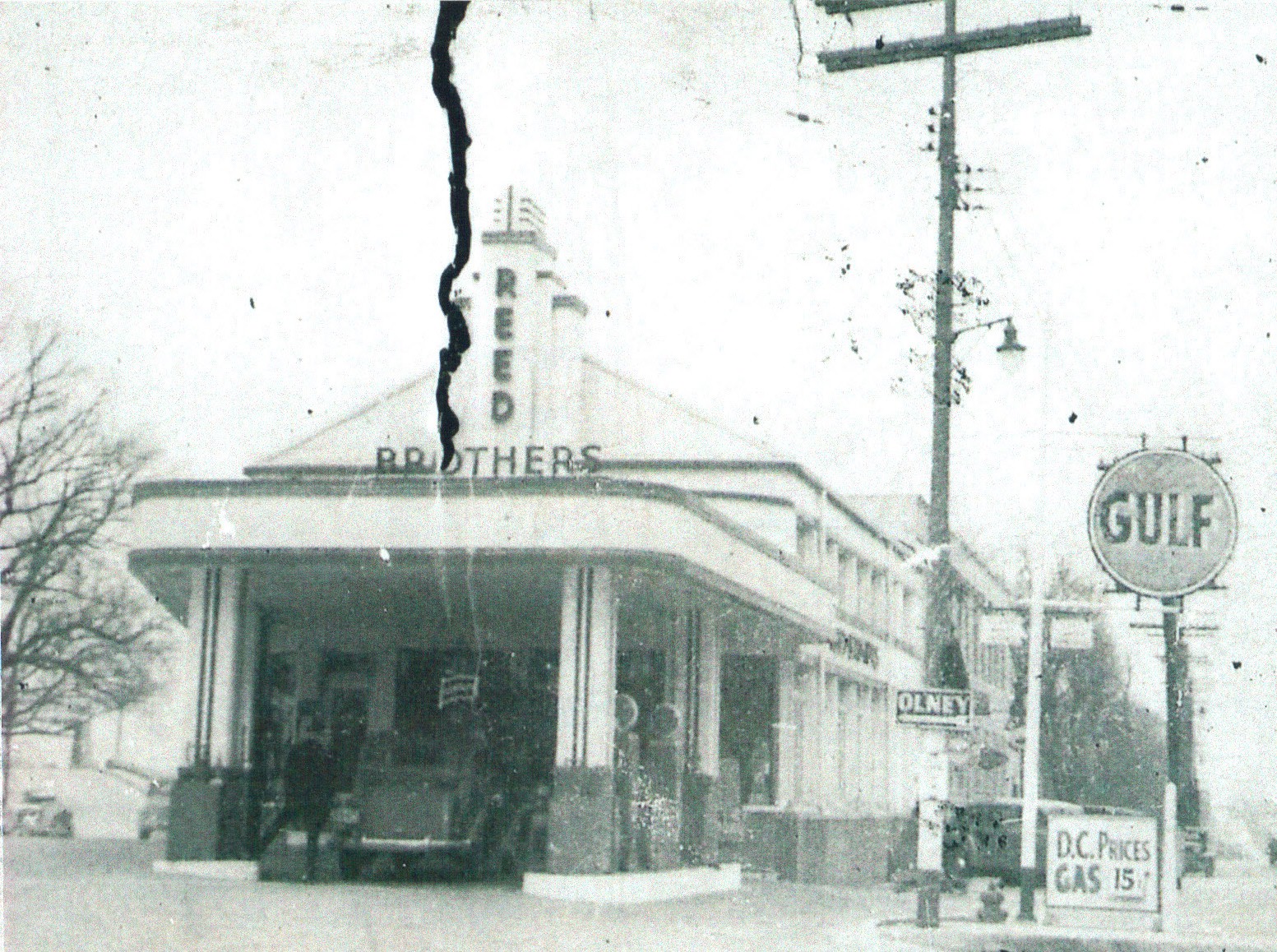 Reed Brothers Dodge canopied Gulf Gas Station circa 1936. A closer look reveals the price of gasoline as 15 cents. On the right attached to a telephone pole is a sign pointing the way to Olney. In addition to the Gulf signage there is a small, barely visible sign below that promotes, “Clean Rest Rooms”.
