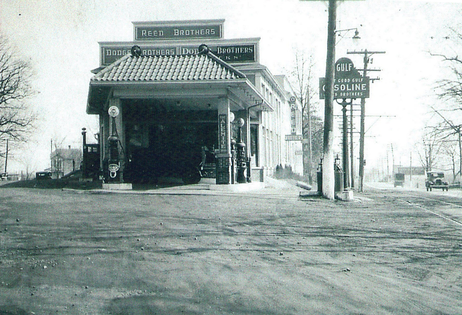 1920’s Reed Brothers Dodge at the Triangle in Old Rockville at the intersection of Veirs Mill Road and Rockville Pike with Gulf Gasoline drive-through filling station. Trolley car tracks can be seen on the right on Rockville Pike.