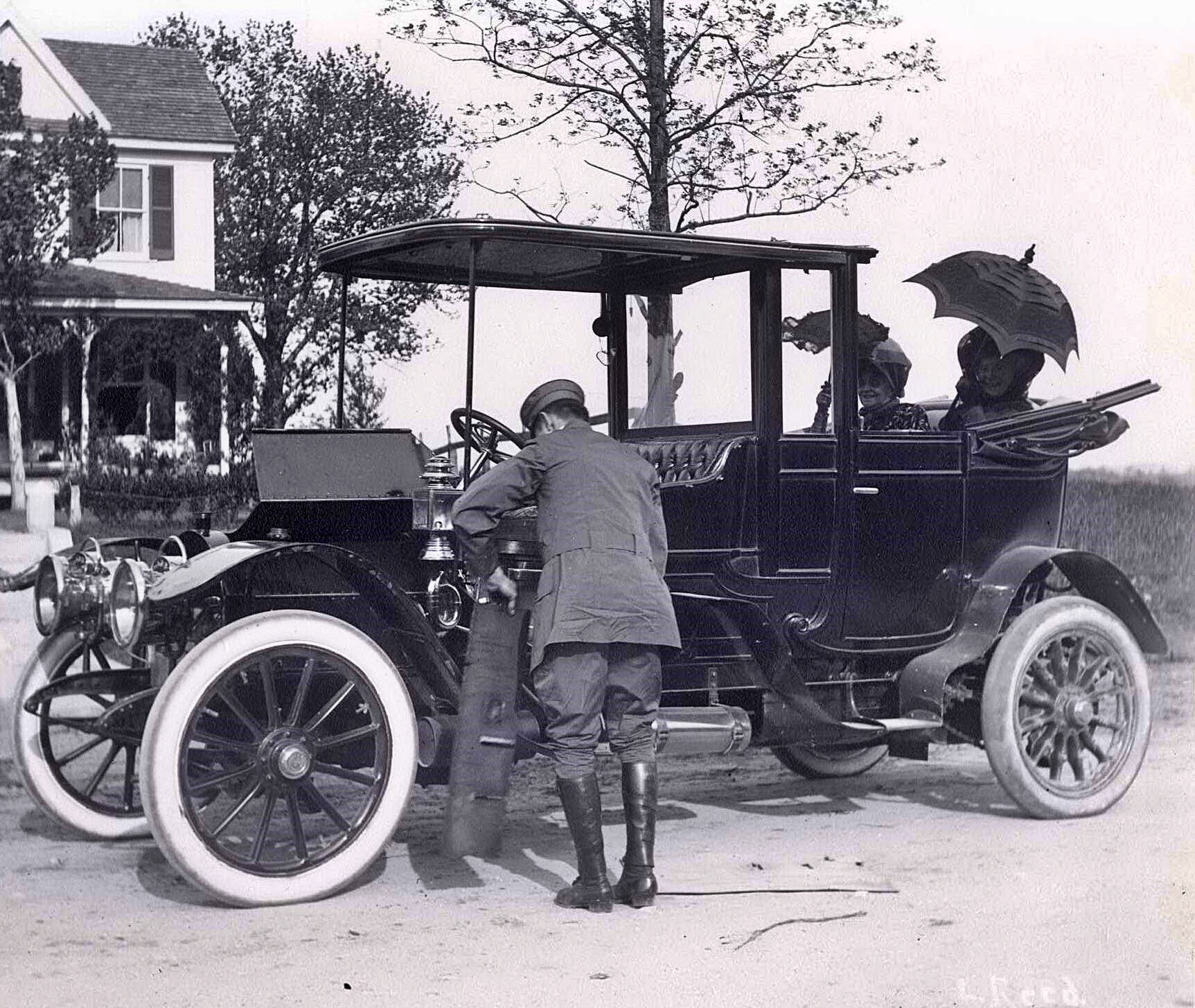 Two ladies with parasols are sitting in the landaulet section of an early Pierce-Arrow limousine, while chauffeur Lewis Reed tends to the motor. The rear portion of the limousine is partitioned from the driver with a glass shield, and covered by a convertible top, which you can see is currently in the lowered position behind the ladies.