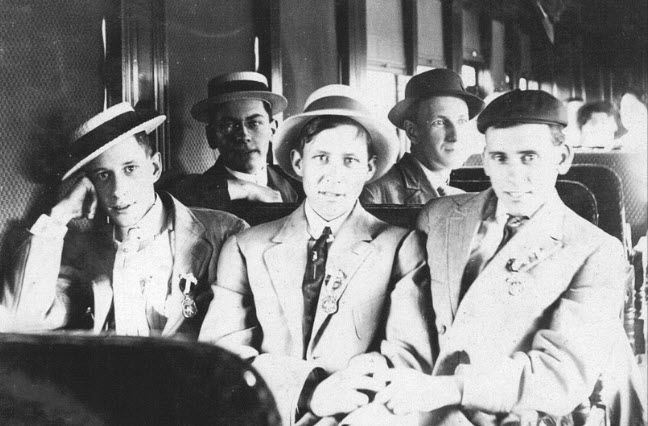 Below is Edgar Reed and friends returning home on the train after the war ended wearing the World War I “Victory Medal” on their lapels.