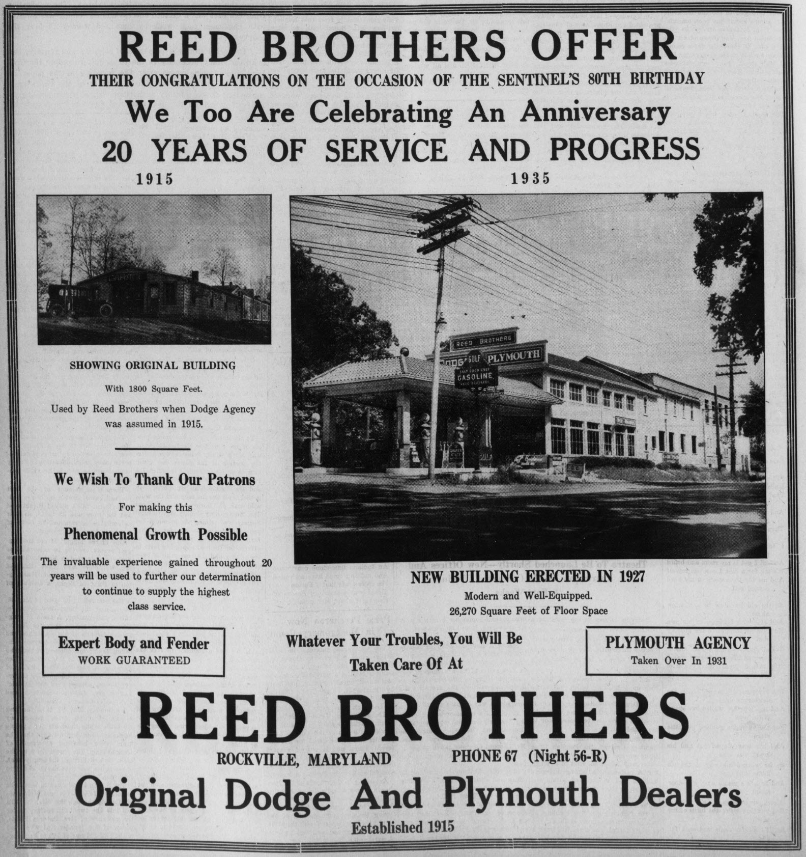 Reed Brothers celebrated its 20th anniversary, which coincided with the Montgomery County Sentinel‘s 80th anniversary in 1935.