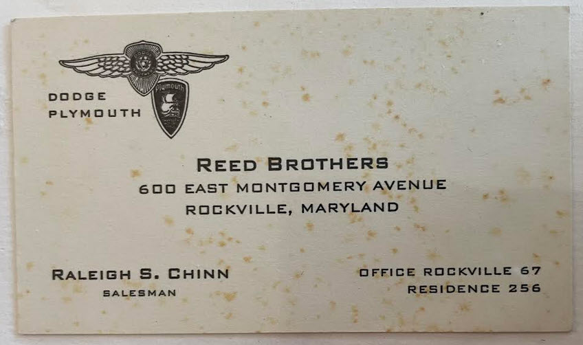 This Reed Brothers Dodge & Plymouth Service Invoice is dated June 28, 1944. $5.00 labor and 90 cents parts for a total of $5.90. The dealership’s address at the time was 600 East Montgomery Avenue Rockville. H.L. England’s name is on the invoice and his car was a 1941 Dodge Coupe.