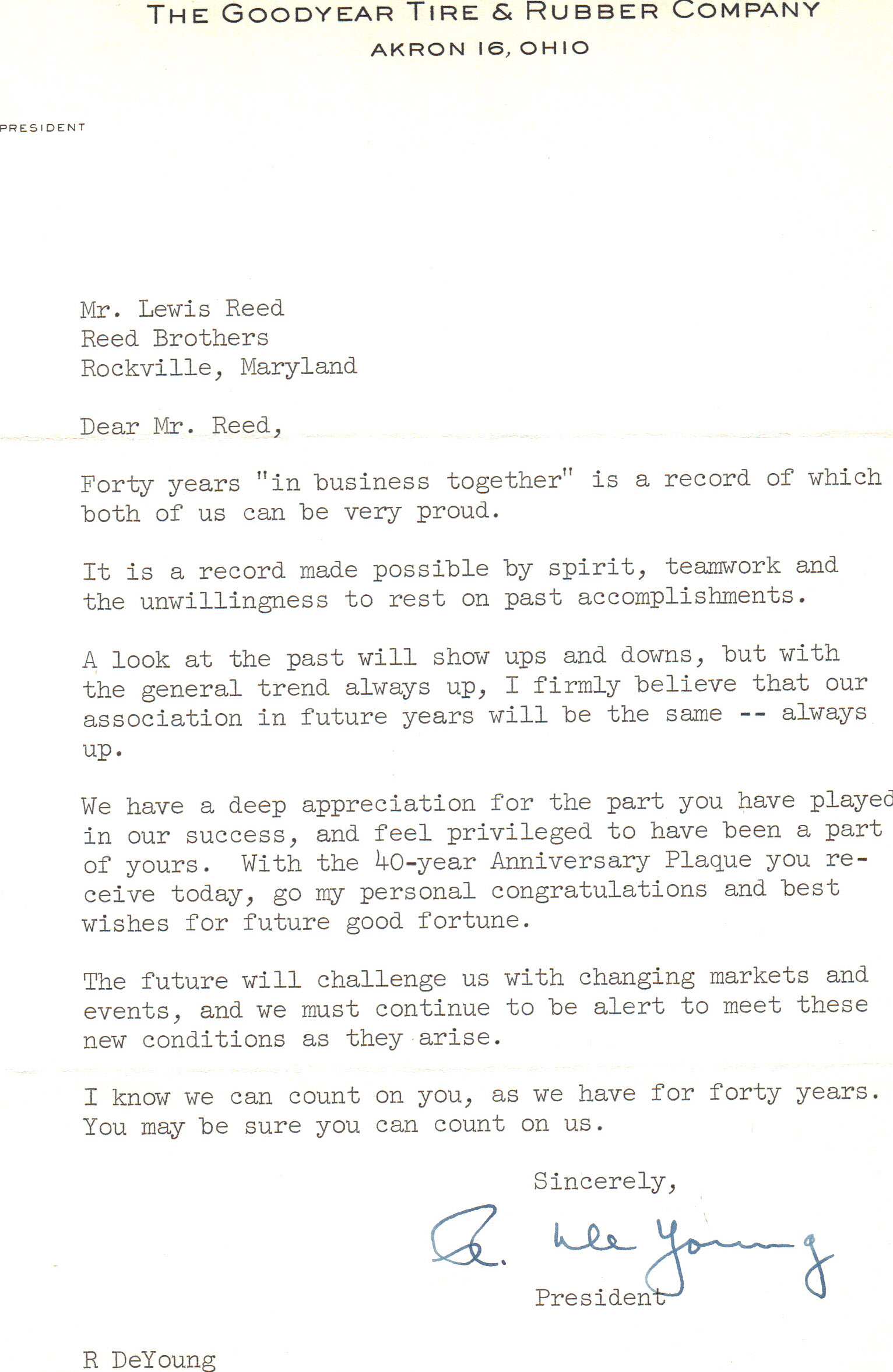 Lewis Reed was recognized by Goodyear Tire & Rubber Co. for reaching his 40th year as a Goodyear dealer. Reed Brothers Dodge began selling Goodyear tires in the 1920s.  Below is a letter from Russell DeYoung thanking Lewis Reed for his 40 years “in business together”.