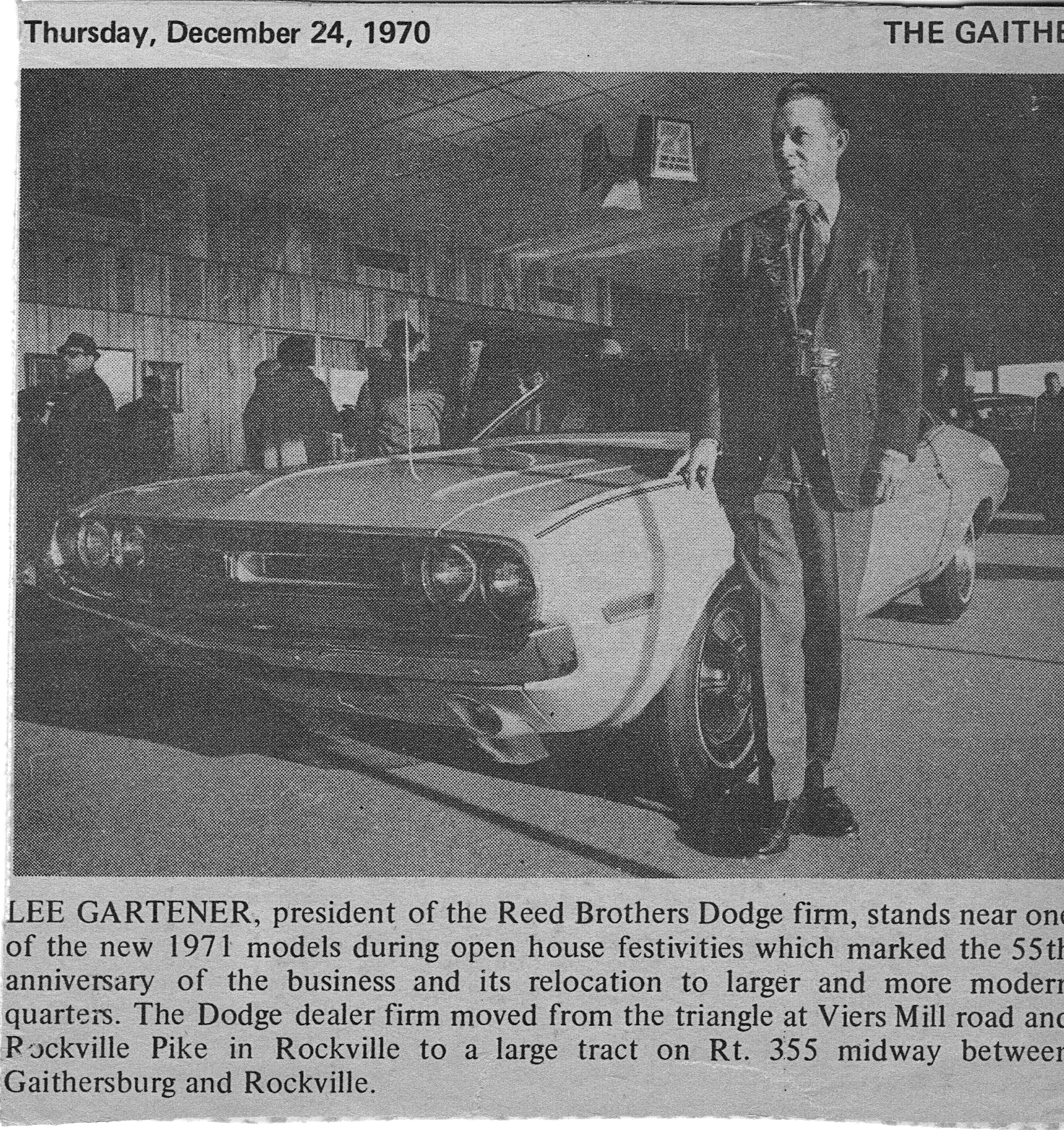 When the state widened the roads in 1970, Lee Gartner purchased 4.37 acres of land from Eugene Casey and relocated Reed Brothers Dodge to a new state-of-the-art showroom and Dodge/Chrysler/Jeep service complex on Route 355 at 15955 Frederick Road in Rockville Maryland.