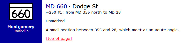 The connector street was so short that Lewis Reed always joked, if the state wanted to name a street after him, the street needed to be longer. Hence the street was named, “Dodge Street”. Maryland Route 660 is the unsigned designation for Dodge Street, which runs 0.05 mi from Rockville Pike (MD 355) north to Veirs Mill Road (MD 28) in Rockville. Dodge Street is one of the shortest highways in the state of Maryland.