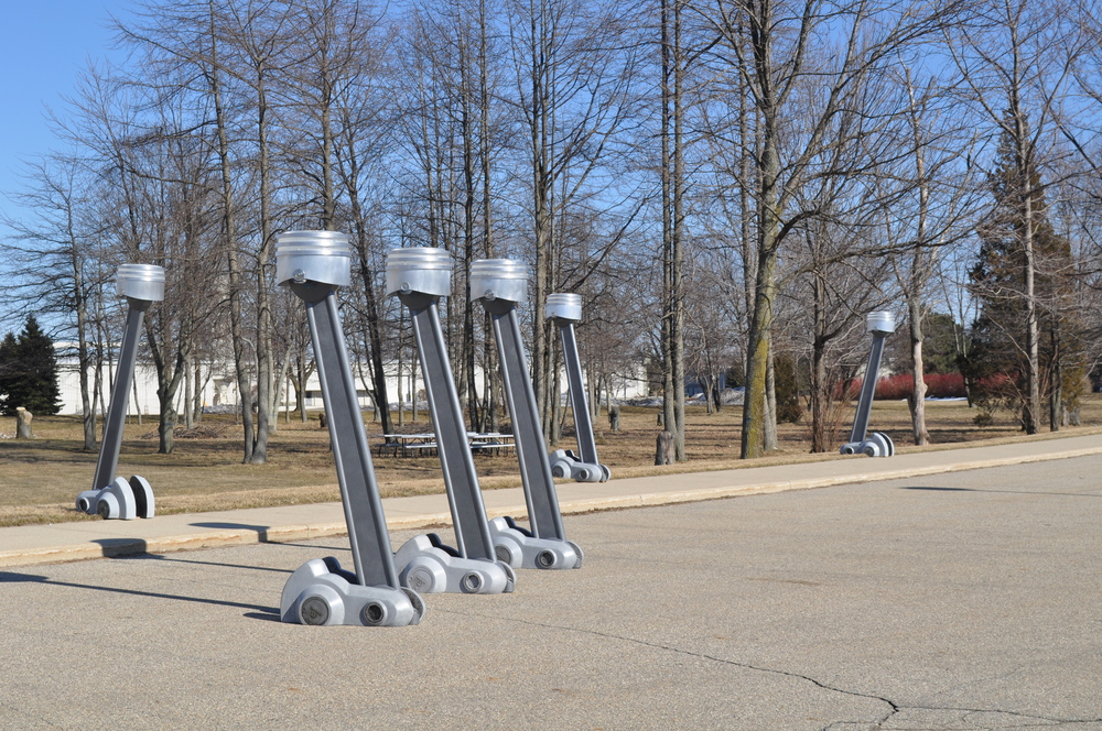 The Art Story: When The Bainbridge Companies wanted designs about Dodge cars for the new Shady Grove development, they specifically wanted studies about the famous Dodge engines. Tj did a series of designs for sculpture, architectural ornaments and furnishings for the project. Though the “Light Dodger” was chosen for the main sculpture, they said the Hemi Piston Street Lamps were just too cool and had to be included.