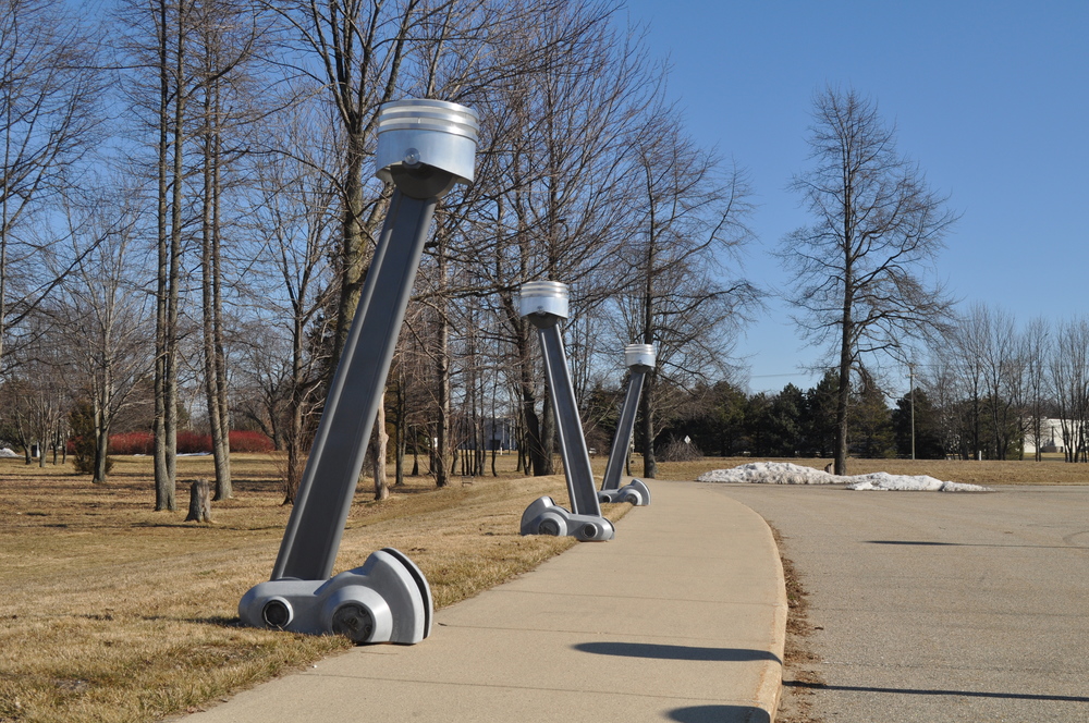 The ½ inch thick glass globes were re-purposed from an old Michigan factory. These were clad with aluminum rings and skirt and rewired for high efficiency fluorescent lighting. The steel connector rod form was fabricated from C&C laser cut components and powder coated. The crank shaft cams at the base are cast concrete.