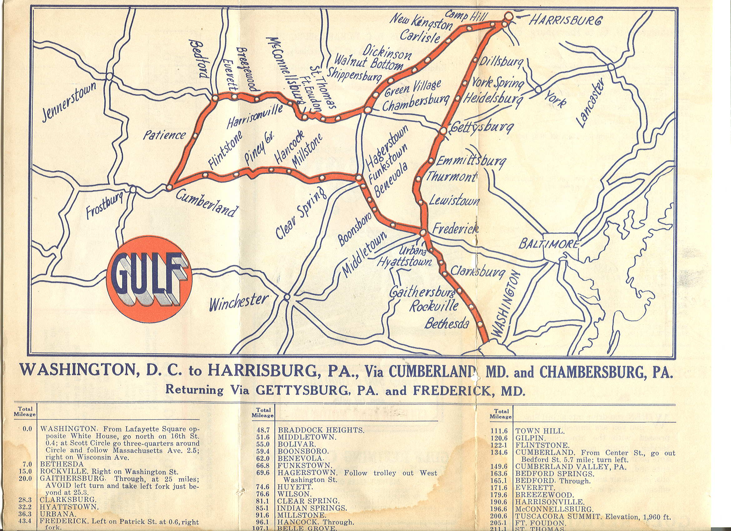 1929 WASHINGTON, D. C. TO HARRISBURG, PA. VIA CUMBERLAND, MD. AND CHAMBERSBURG, PA. RETURNING VIA GETTYSBURG, PA. AND FREDERICK, MD.