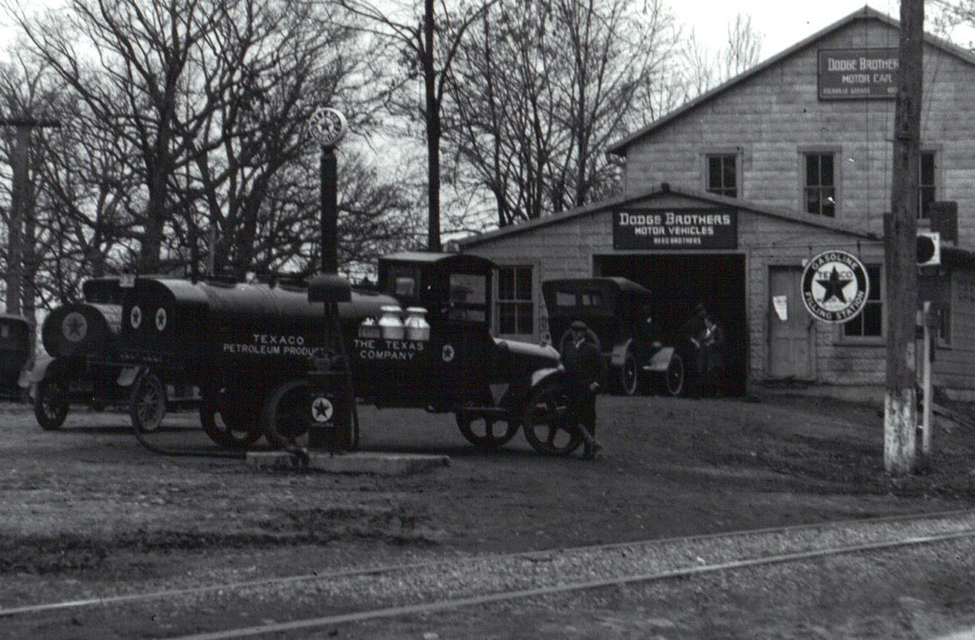 A circa 1917 Texaco Petroleum Truck sits in front of Reed Brothers Dodge after delivering its load of fuel.