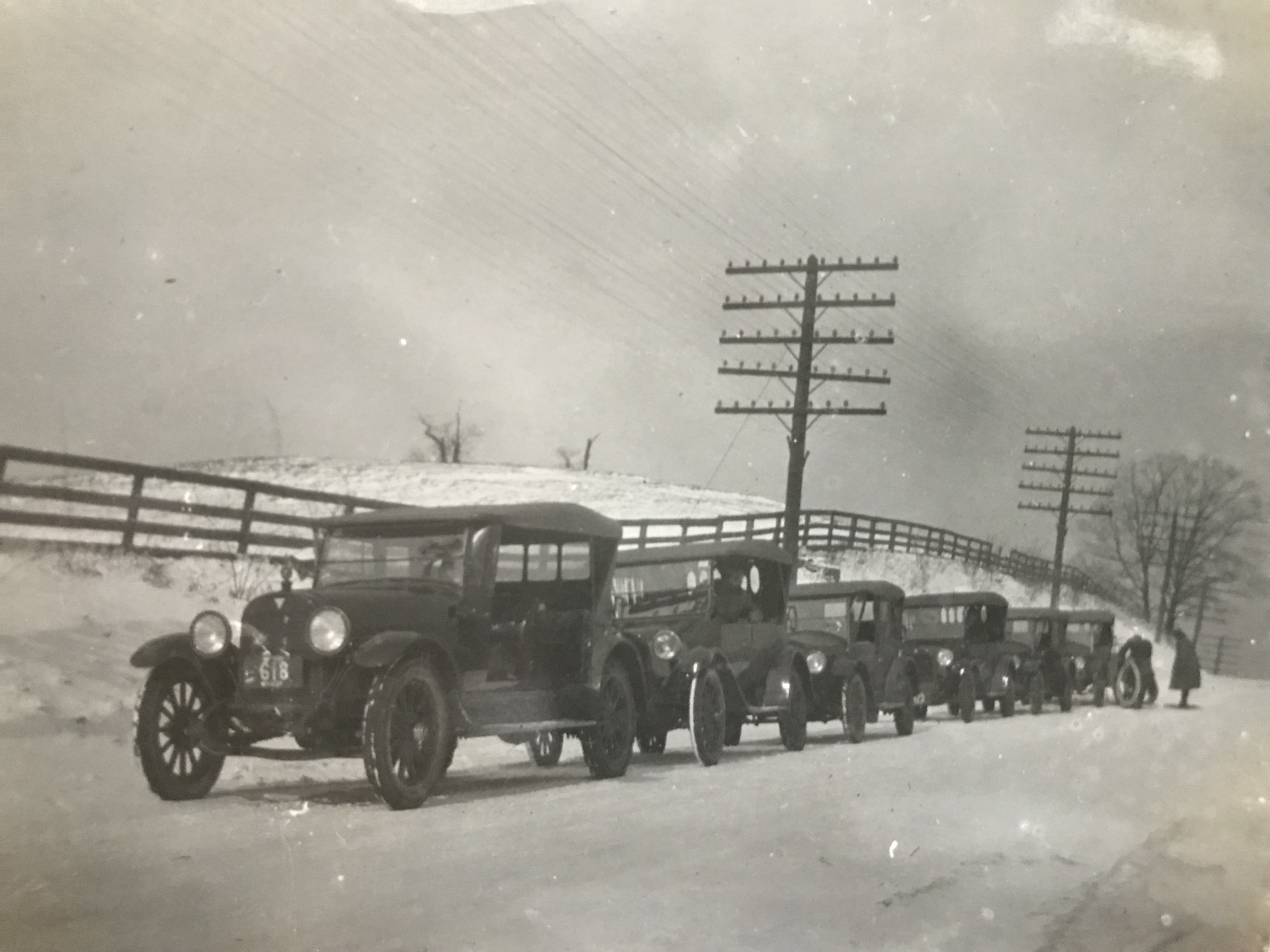 Line of Dealer cars stopped on Goshen Road.The car at the rear appears to be getting a helping hand to change a flat tire