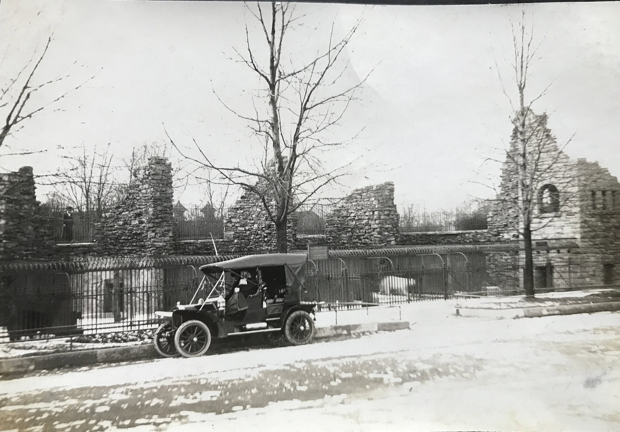 Buffalo Zoo Bear Pits, Buffalo, New York, ca. early 1920s. Note the car in the photo is mostly open-bodied, with no windows and certainly no heat. Tire chains are on the rear tires. I cannot say with any certainty, but I believe it is Lewis Reed’s car with his wife and baby daughter, Mary Jane, sitting inside all bundled up. Photo by Lewis Reed.