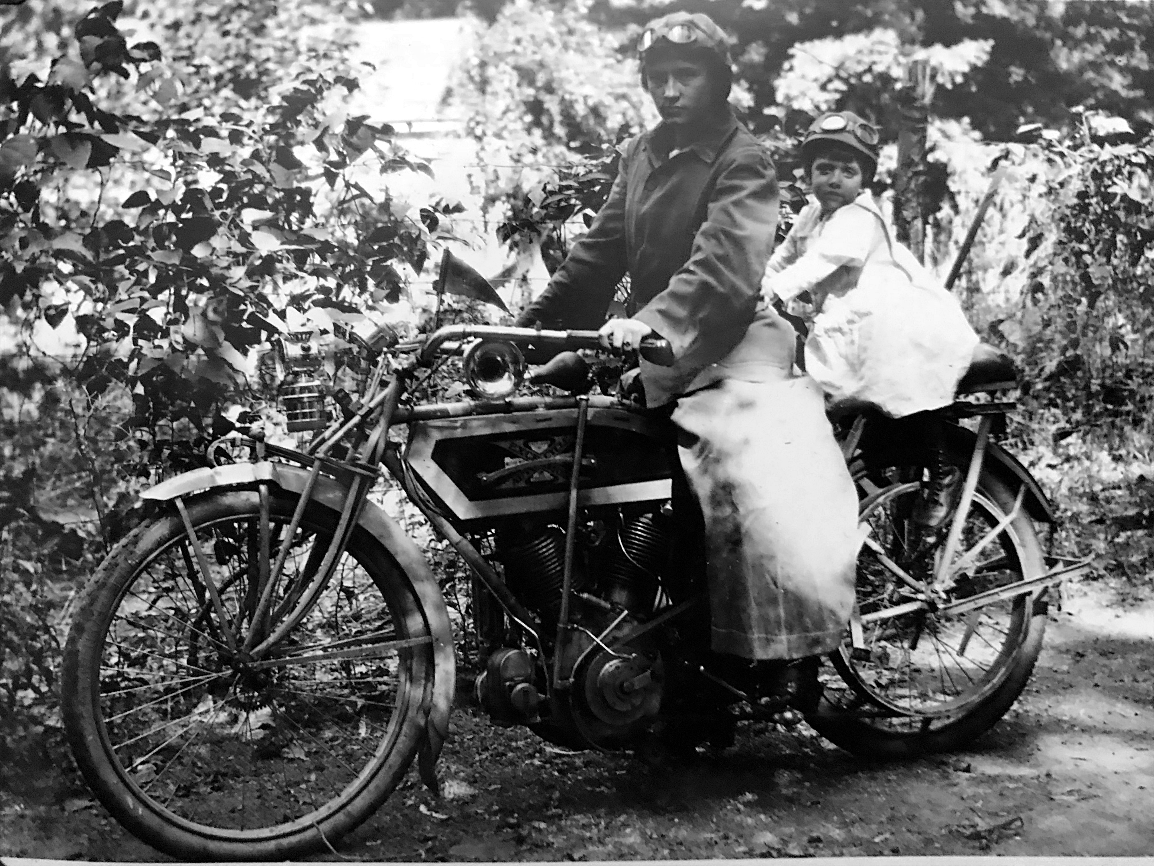 Woman and toddler pose on an Excelsior motorcycle. (The toddler’s sporty little cap and goggles are only for show: she won’t be going for a ride!) The motorcycle seems to be well equipped with extras including: a headlamp, a handlebar-mounted Klaxon horn, and a well-padded passenger seat on the back.