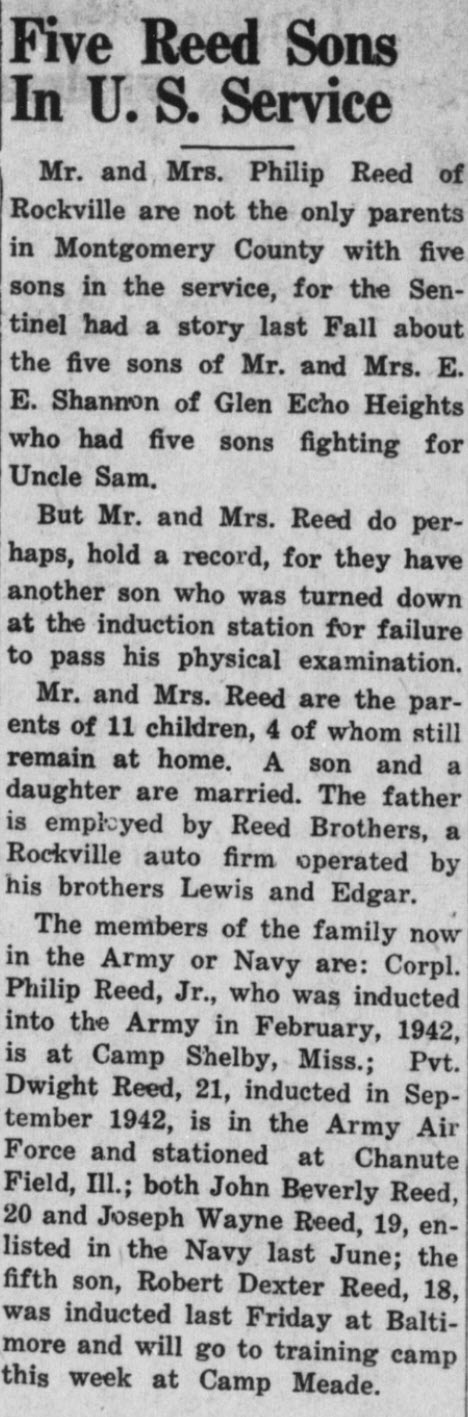 With Veterans Day taking place on Monday, November 11, I would like to recognize 5 of Philip Reed’s sons who served in the military. Philip Reed was employed by Reed Brothers Dodge owned and operated by his brothers Lewis and Edgar.