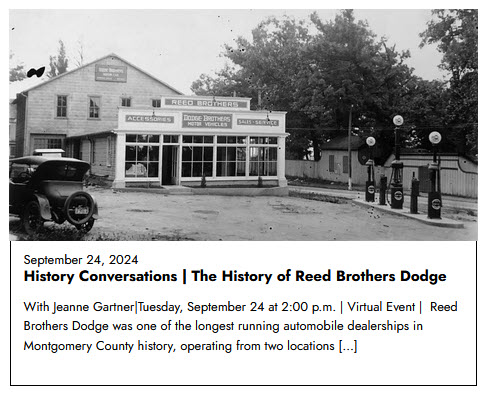 Opened September 24, 2024Curated by Jeanne Gartner and Sarah Hedlund Montgomery History has unveiled a new online exhibition titled “Reed Brothers Dodge – Montgomery County’s Oldest Dodge Dealership.” Officially launched on September 24, 2024, the exhibition was co-curated by Jeanne Gartner, author of the Reed Brothers Dodge History blog and co-owner of the former dealership, […]