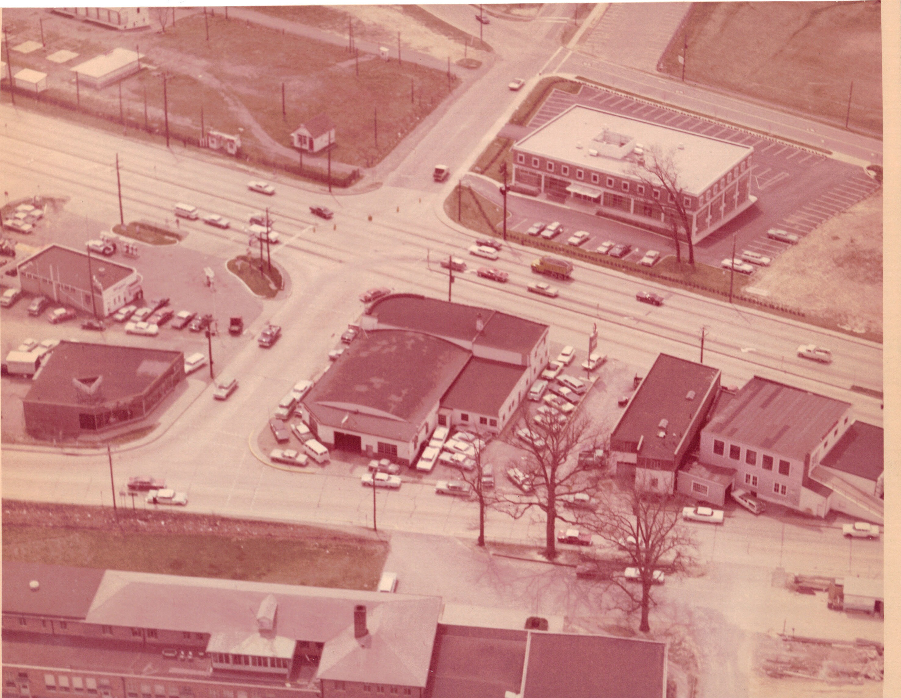 Later aerial view showing the used car lot where previously stood a two-story house. St Mary’s Church at lower portion of photo