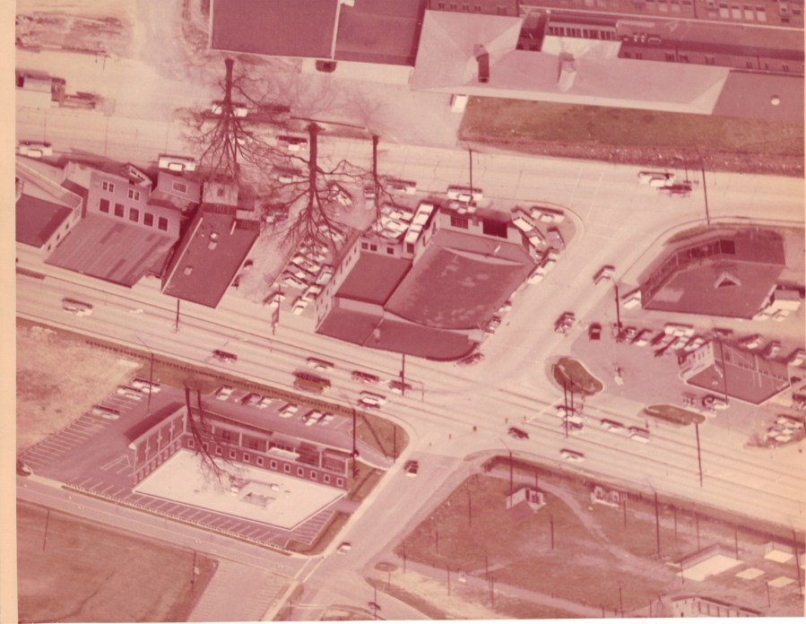 Later aerial view showing the used car lot where previously stood a two story house. St Mary’s school is at lower portion of photo