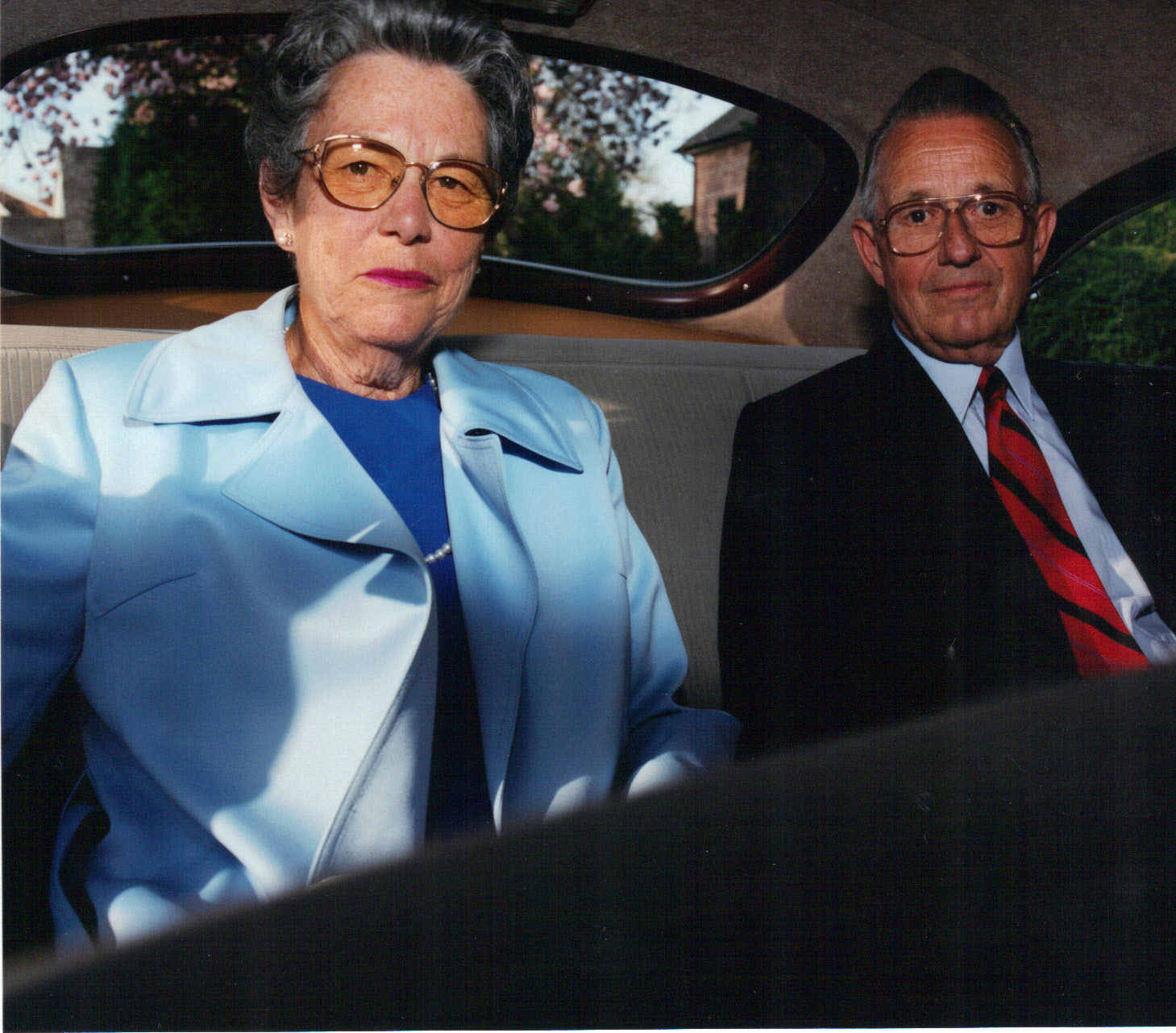 Mary Jane & Lee Gartner sitting in back of ’46 Dodge Deluxe