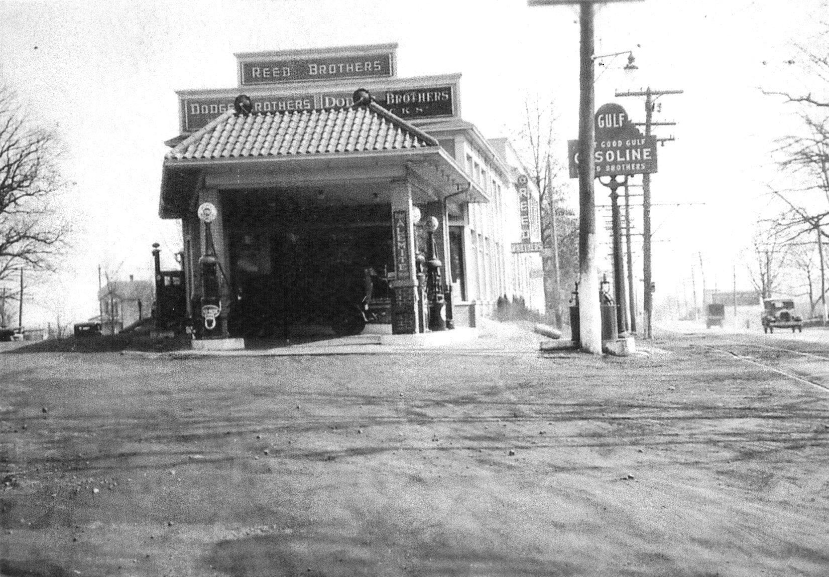 Late 1920’s front with Gulf Gasoline drive-through filling station. A modern drive-through canopy was added along with new gasoline pumps and Dodge Car and Truck signage. The Alemite sign in front indicates that Reed Brothers also sold and used the Alemite lubricating system.