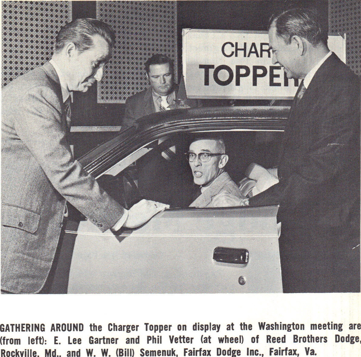 Gathering around the Charger Topper on display at the Washington meeting are (from left) Lee Gartner, Dealer President/Principal and Phil Vetter (at wheel), Service Manager of Reed Brothers Dodge.