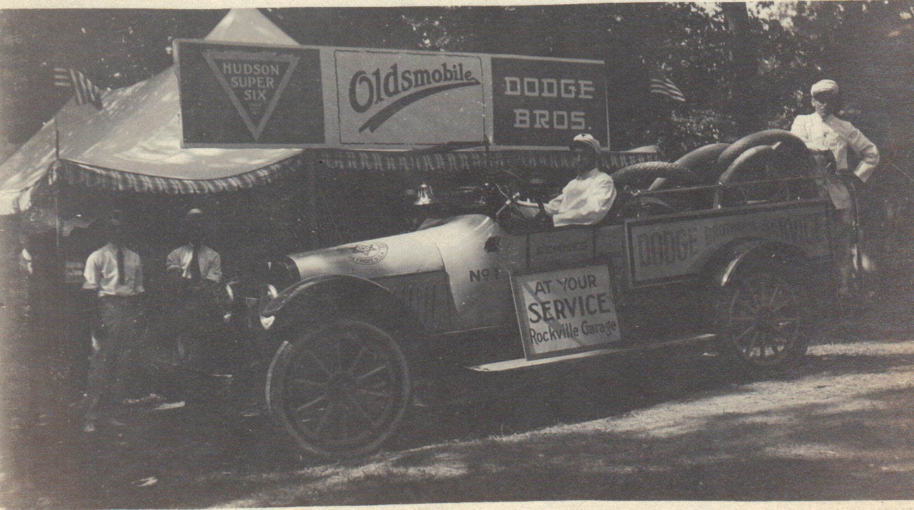 Rockville Garage, 1918 – Hudson Super Six, Oldsmobile, and Dodge Brothers Motor Cars on display at Rockville Fairgrounds. Lewis Reed is seated in the drivers seat of the Rockville Garage Service Truck.