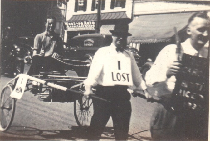 The story of two Reed Brothers employees (Francis O. Day, Salesman and Guy Murray, Shop Foreman) who made a bet on who would win a local election. It’s pretty obvious that Guy Murray won the bet, because he is being pulled by Francis Day through downtown Rockville in a horse cart. I thought only horses could pull those things, but I see grown men can, too!