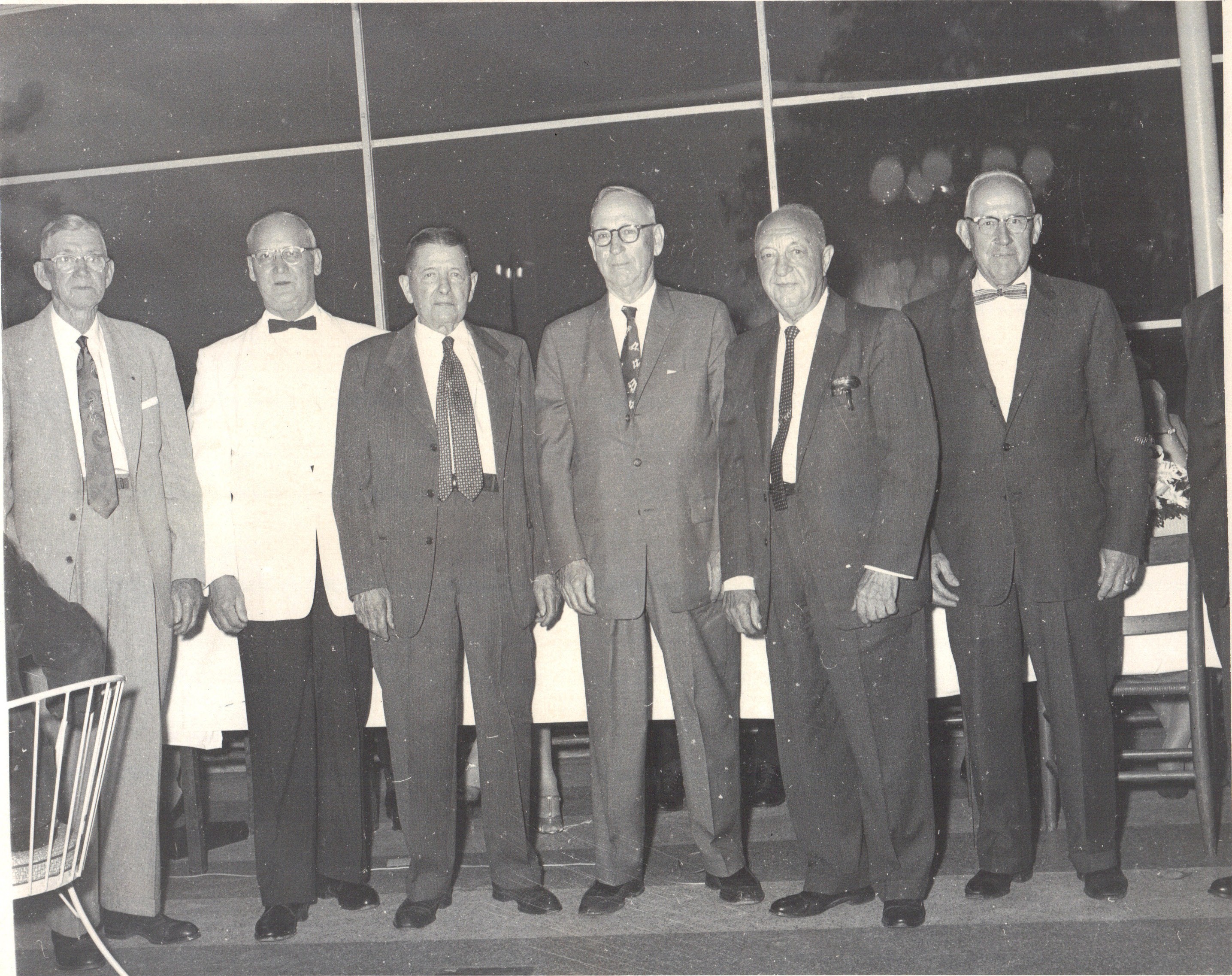 Past Officers of the Gaithersburg-Washington Grove Fire Department. Pictured left to right: name unknown, Ernest C. Gartner, Charles Fox, Clyde Thomas, Dr. Frank Broschart, Lewis Reed