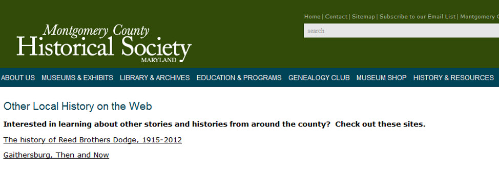 The Montgomery County Historical Society (Maryland) has just added a new page to the History & Resources section of their website, entitled “Other Local History on the Web“. Reed Brothers would like to acknowledge with much appreciation, the Montgomery County Historical Society for placing a link to our history blog on their new page, so we may now be able to preserve and share our heritage with future generations.