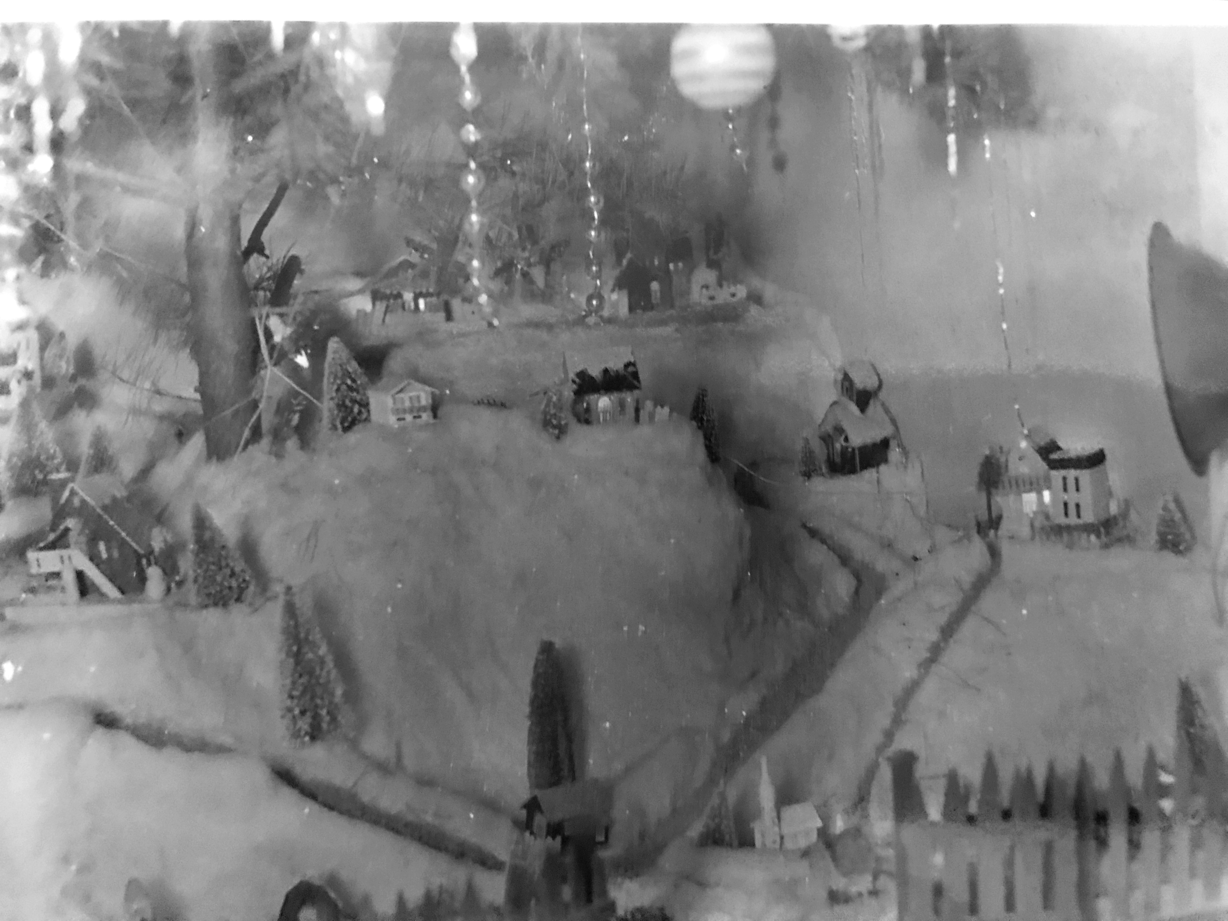 The snow villages were set up in Lewis Reed’s basement on top of a big table beneath a small Christmas tree. He made the snow scenes entirely by hand using wire-covered cardboard and balled up paper to make hills and pathways. The little houses and figurines would fit into the landscape with cotton ‘snow’ all around; and lights would be wired underneath.