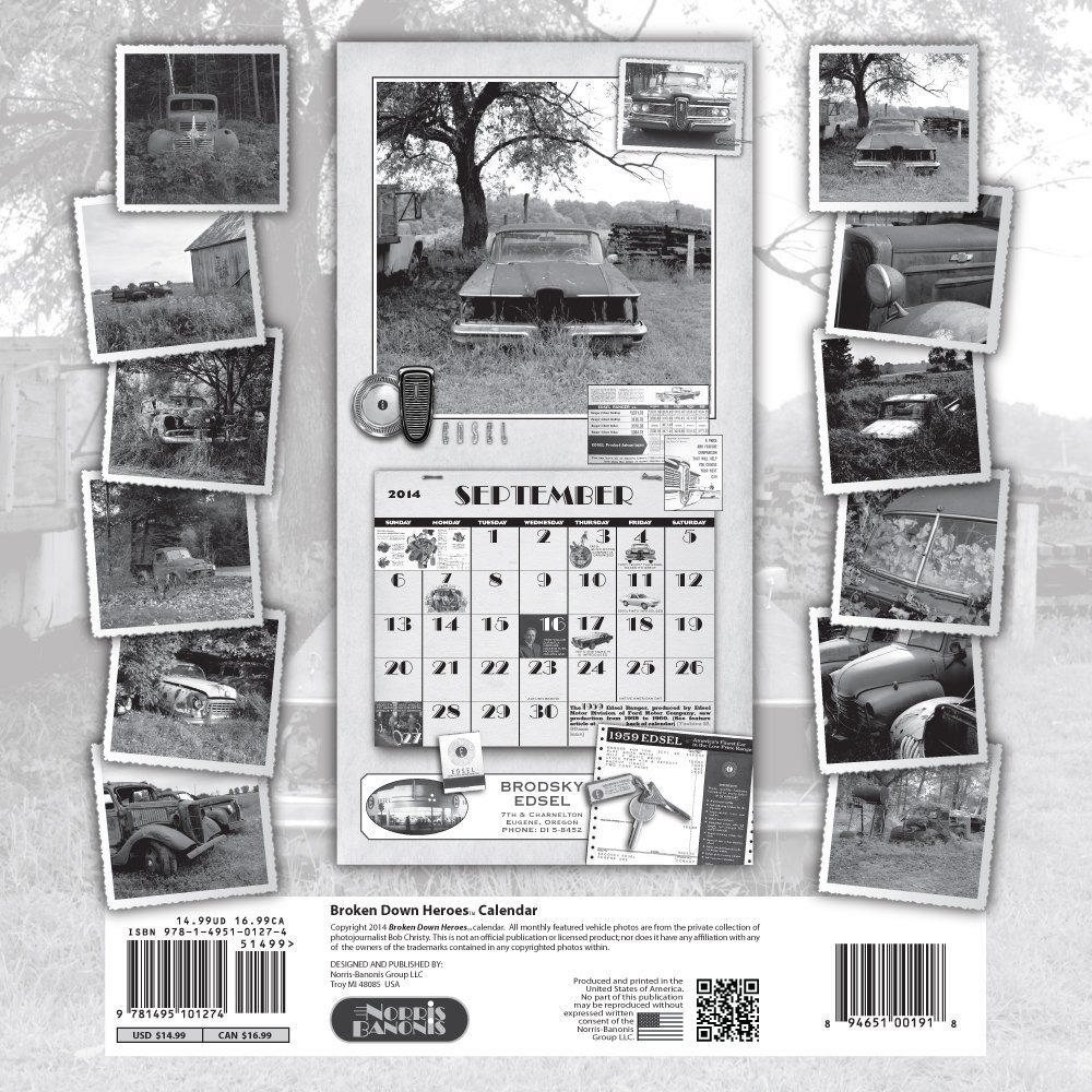The calendar is entitled, “Broken Down Heroes”, which showcases twelve months of old abandoned, but not forgotten vehicles found in fields across the U.S. The calendar is in high resolution black and white and highlights the artistic nature of the photographs by noted photographer Bob Christy. Also included throughout are significant and unusual dates in automotive history. The inside back cover features a 2-page “The EDSEL is on its way!” photo essay.